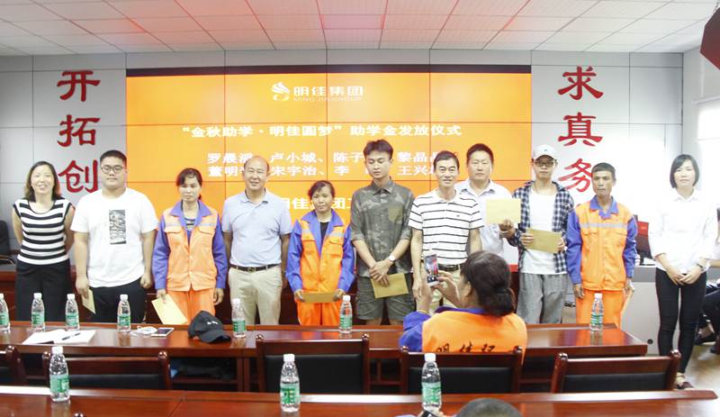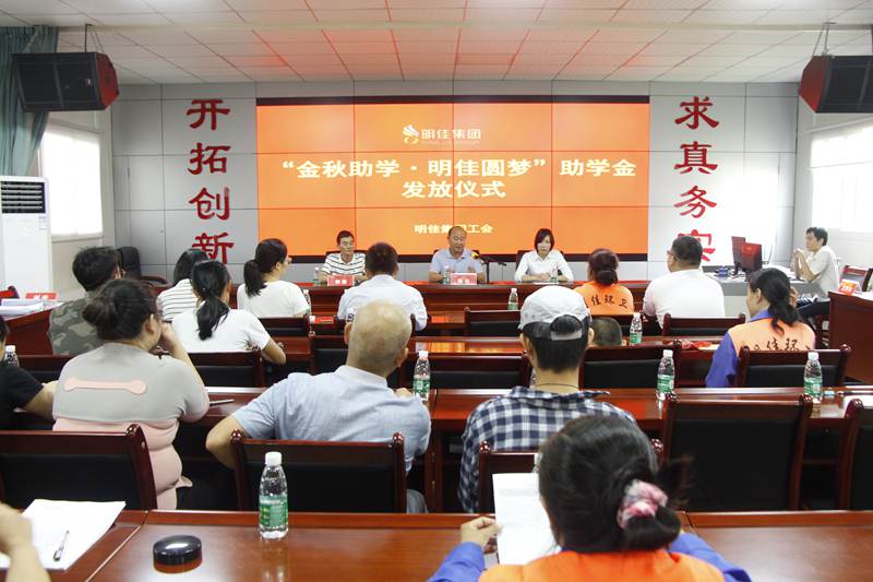 8月28日上午,明佳集團(tuán)工會“金秋助學(xué)·明佳圓夢”助學(xué)金發(fā)放儀式在集團(tuán)公司三樓會議室舉行,為8個(gè)考取大學(xué)的職工子女發(fā)放助學(xué)金共計(jì)9600元??偛藐愒啤⒏笨偨?jīng)理鐘寒參加發(fā)放儀式,儀式由工會主席高斐斐主持。