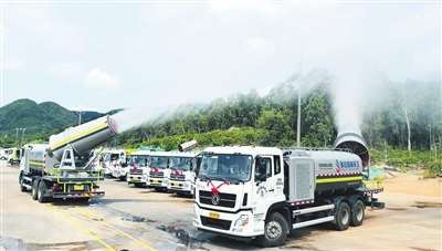 5月9日,三亞新增的21輛新型環(huán)衛(wèi)車同時亮相,整裝待發(fā)。圖為兩輛多功能抑塵車現(xiàn)場展示噴霧抑塵功能。