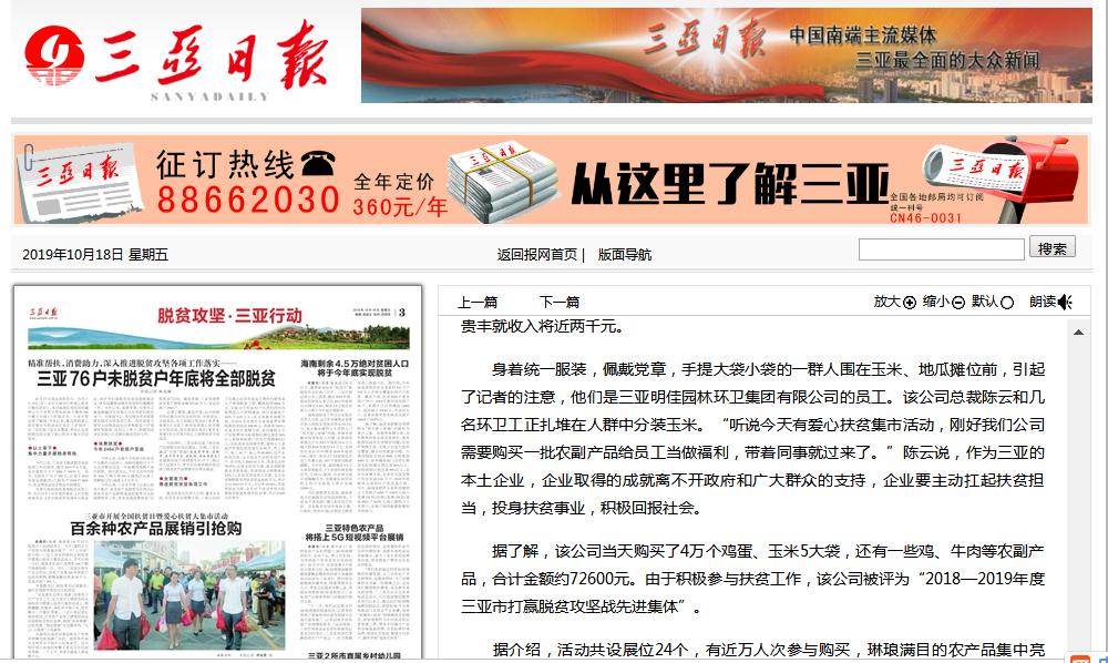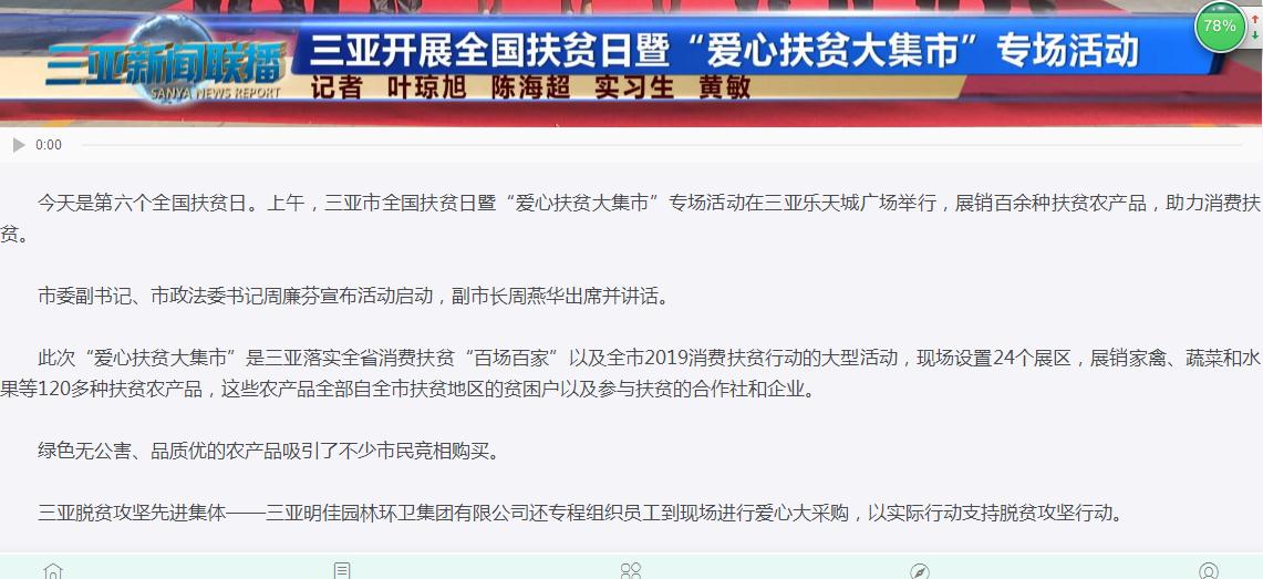 明佳集團(tuán)作為三亞的本土企業(yè),主動(dòng)扛起扶貧擔(dān)當(dāng),投身扶貧事業(yè),積極回報(bào)社會(huì)。在此次大采購活動(dòng)中,集團(tuán)員工在總裁陳云的帶領(lǐng)下,購買了4萬個(gè)雞蛋、玉米5大袋,還有一些雞、牛肉等農(nóng)副產(chǎn)品,合計(jì)金額約72600元。三亞日?qǐng)?bào)和三亞新聞聯(lián)播分別對(duì)明佳集團(tuán)的愛心大采購活動(dòng)進(jìn)行了報(bào)道。