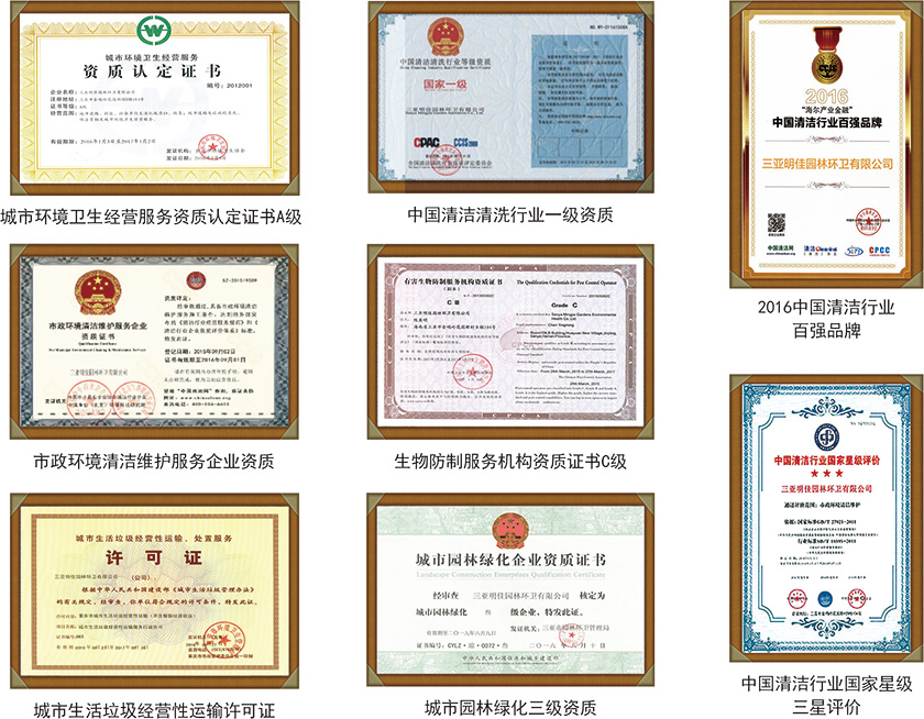 公司擁有建筑物外立面清潔養(yǎng)護(hù)施工甲級資質(zhì)、建筑物有害生物防治施工甲級資質(zhì)、建筑物日常清潔養(yǎng)護(hù)施工甲級資質(zhì)、中國清潔行業(yè)企業(yè)等級一級資質(zhì)證書、城市園林綠化企業(yè)資質(zhì)證書、有害生物防制服務(wù)機(jī)構(gòu)資質(zhì)證書C級、有害生物防制服務(wù)機(jī)構(gòu)C級資質(zhì)證書、中國清潔清洗行業(yè)國家一級等級資質(zhì)、城市生活垃圾經(jīng)營性清掃、收集、運(yùn)營許可證;城市生活垃圾經(jīng)營性運(yùn)輸、處置工作許可證、環(huán)境管理體系認(rèn)證證書、城市環(huán)境衛(wèi)生經(jīng)營服務(wù)資質(zhì)認(rèn)定證書(GB/T240012004/IOS14001:2004標(biāo)準(zhǔn))、職業(yè)健康安全管理體系認(rèn)證證書(GB/T28001—2011/OHSAS18001:2007標(biāo)準(zhǔn))、質(zhì)量管理體系認(rèn)證證書(GB/T19001—2008/iOS9001:2007標(biāo)準(zhǔn))、市政環(huán)境清潔維護(hù)服務(wù)企業(yè)資質(zhì)證書